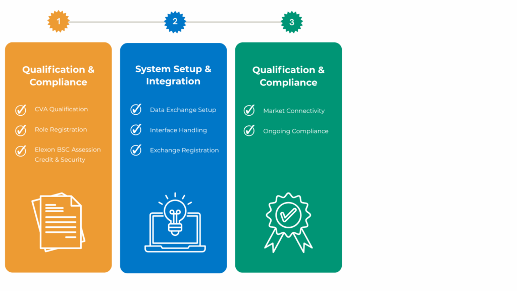 | Qualification & Compliance | Full management of CVA Qualification and substantial support with the rigorous SAD process. We handle the technical integration and data flows with Elexon. | Go live faster: accelerate your time-to-market by offloading the most time intensive and specialist compliance work. |